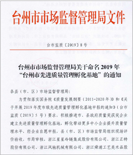 2019年8月19日,臺州市市場監(jiān)督管理局發(fā)布了臺市監(jiān)質(zhì)[2019]8號文件關(guān)于命名2019年“臺州市先進(jìn)質(zhì)量管理孵化基地”的通知,我公司在2019年度臺州市級先進(jìn)質(zhì)量管理孵化基地申報項目申報工作中,經(jīng)市場監(jiān)管局組織現(xiàn)場評價驗收,市局審核,同意命名為“臺州市先進(jìn)質(zhì)量管理孵化基地”。