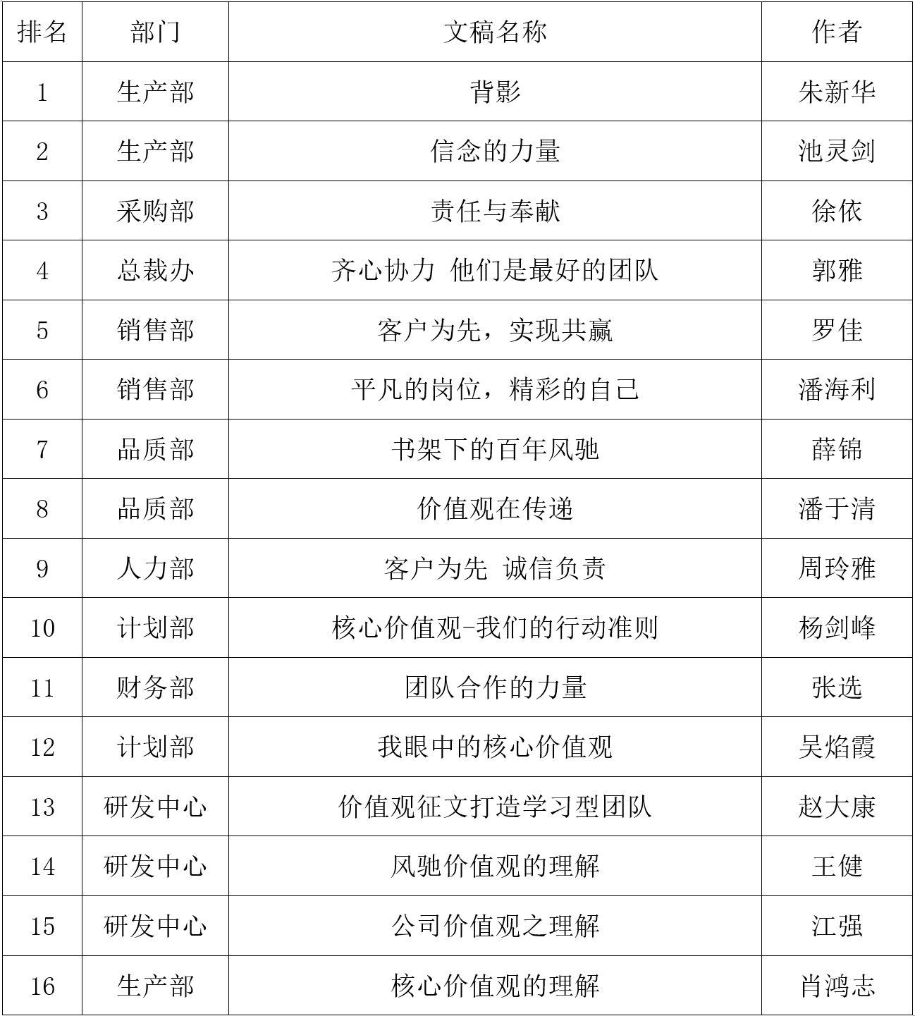 首先,評(píng)審組10位評(píng)委根據(jù)價(jià)值觀主題、文稿內(nèi)容,觀點(diǎn)表達(dá)清晰度,事實(shí)案例,語(yǔ)言表達(dá)流暢,文稿整體結(jié)構(gòu)完整性,幾個(gè)方面對(duì)稿件進(jìn)行了認(rèn)真的打分,再依據(jù)分值排名匯總至執(zhí)行總裁最終審核,得出最終評(píng)審結(jié)果:生產(chǎn)部朱新華的《背影》一文一舉奪魁,文中沒(méi)有華麗的文字,沒(méi)有網(wǎng)紅的心靈雞湯,只是簡(jiǎn)單的言語(yǔ),背后卻道出了我們公司的價(jià)值觀,平凡崗位上忙碌的背影深深印刻在每位風(fēng)馳人的心中,文章獲得評(píng)委們的一致好評(píng)。生產(chǎn)部池靈劍的《信念的力量》立場(chǎng)鮮明,主題突出,讓人感到信念的是一種熱烈的,一種噴薄而出,一種昂揚(yáng)斗志的力量,喜獲二等獎(jiǎng);采購(gòu)部徐依的《責(zé)任與豐獻(xiàn)》,總裁辦郭雅的《齊心協(xié)力,他們是最好的團(tuán)隊(duì)》并列三等獎(jiǎng)。